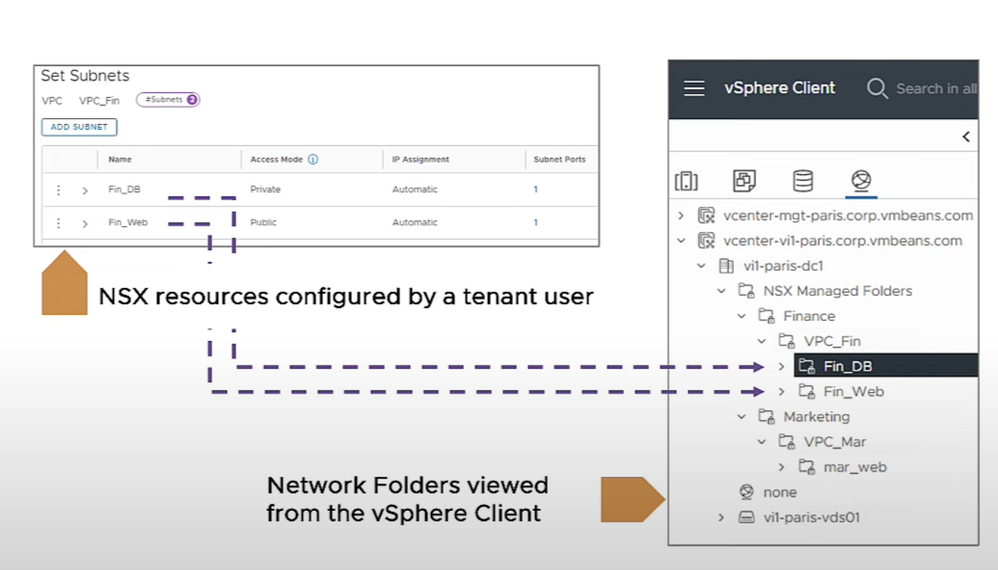 Workloads in VPC can be identified by the subnet, which is visible in vCenter as NSX distributed vswitch port groups. To limit visibility into other VPC resources, it can be secured by resource permissions.