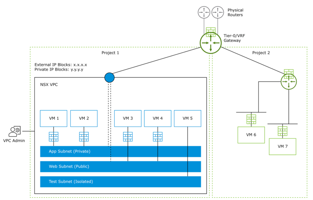 NSX VPCs represent an additional layer of multi-tenancy within a project. It provides a simplified consumption model of networking and security services, which is aligned to the experience that you would have in a public cloud environment.